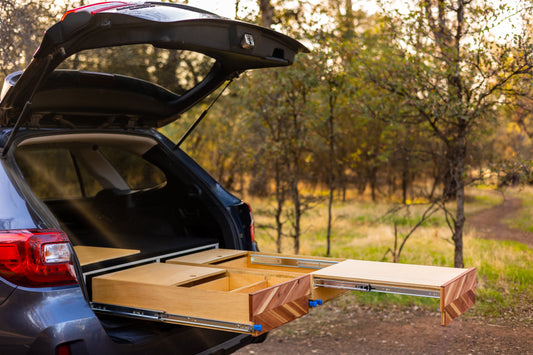 Custom-fit camper platform and drawer system for Subaru Outback. Flat sleep surface, lightweight aluminum frame, easy install. Made to fit Models 2011-2025 years. Select the style camper kit that best suits your adventure.