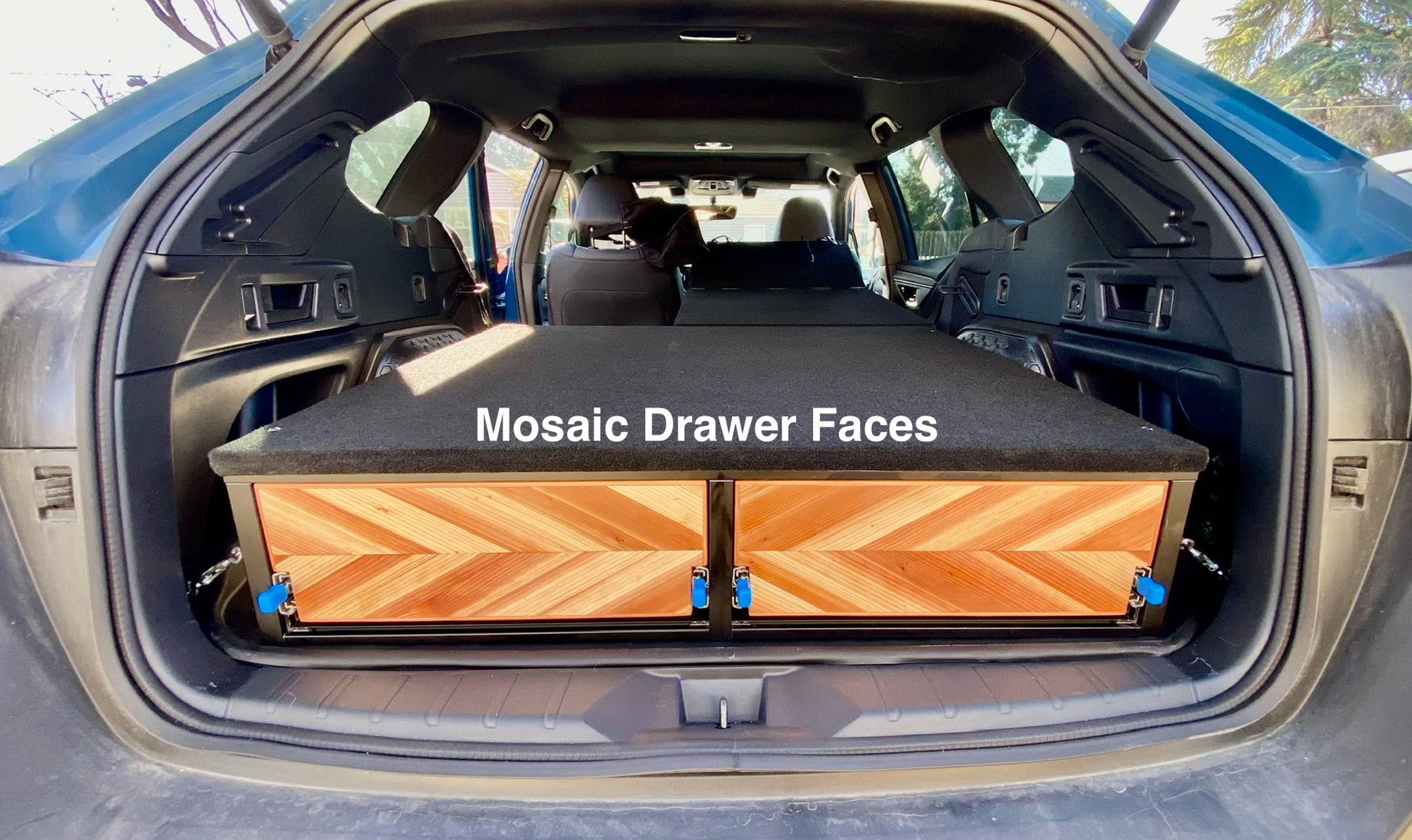 camper conversion kit bed platform inside subaru outback with custom mattress on top and mosaic drawer faces