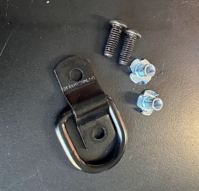 Everything you need to attach D-Rings to 3/4" Plywood.  Used on Compass Campers for Flip-Over Headrest support attachment.  Comes with D-Ring, tee-nut, 3/4" bolts.  Nuts and bolts are 1/4-20 Thread size