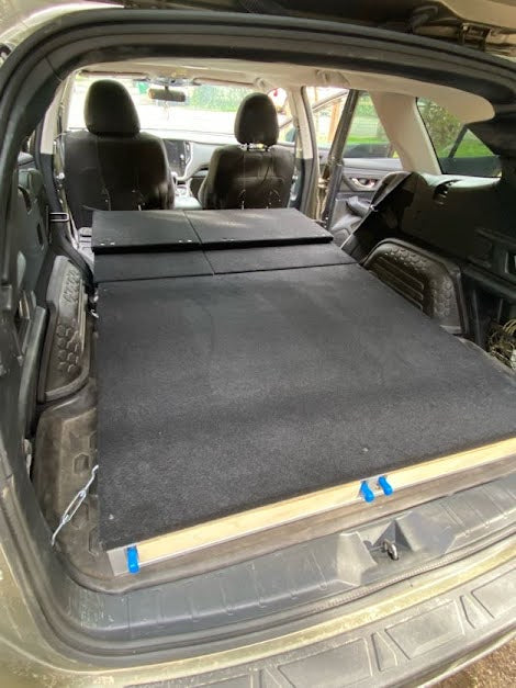 I purchased a kit back in June prior to moving to Alaska for my 24 Subaru Outback. We finally got to do a test run last night (sort of- it was 19 degrees out so we didn’t actually stay overnight) and initially when ordering, I was worried about my 90lb dog fitting with my husband and I. We did some modifications in the ordering process (dropped the platform one inch to maximize headroom and widened the platform to meet the wheelwells) and my dog LOVES it. We got some stairs for him to climb in and he was immediately cozy and happy and the three of us fit so well! While our set up is still a work in progress, I’m happy to say so far so good! I’m excited to really set up our car for off-grid adventures. We got the lift table option, split bed extension, and did a sink cut out with collapsable sink. So so excited to use and will post more pictures in the spring when camping season really starts up!