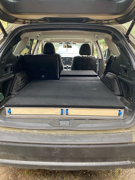 camper conversion kit bed platform inside subaru outback with custom mattress on top and mosaic drawer faces